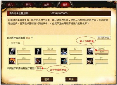 救治步骤四:玩家可以在伤兵界面选择伤兵的兵种和数量治疗伤兵,治愈伤兵需要消耗医疗箱。