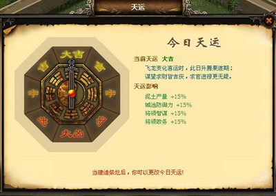 在《天策》中,每天系统会在A**点重新更换天运,玩家每天可以有两次占卜机会(需要建造祭坛)才可以进行占卜。占卜分为:大吉、吉、平、凶、大凶。天运会影响到玩家在游戏中的资源产量、防御力等各个方面。