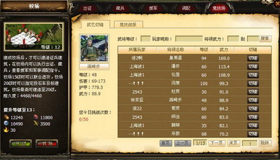 武将竞技场是玩家进行武将单挑的场所,玩家的武将在竞技场中进行单挑不减少生命值,玩家可以在竞技场中和其它玩家的武将进行武艺切磋。