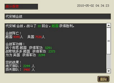 2010年5月2日 4点34分我结束了在吴的最后一战——代安之战。之前的每一战吴都打得精彩,每一次都会给敌人重创,限于个人能力有限,最终虎豹敌不过群狼。