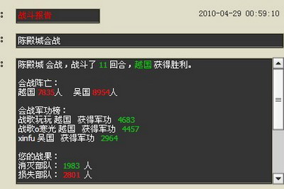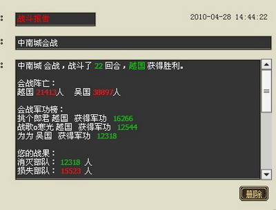2010年 4月28日,越之战歌团为灭吴蜀纠集10余万众,先犯蜀后直奔吴之后方中南,我不得不调动吴之南下部队回防后方重城陈殿。中午时分我吴已经集合一部分主力,我决定派灰去中南一探,战况发回,越人未就位,正当我准备发兵想速拿之时,我吴一主力上线说要半小时到达,鉴于吴之主力实在太少,我早上6点多发的集合令到中午12点还未执行到位,当时为了减少损失决定再等等。主力就位后,吴发动主攻欲取中南。可惜战场机会稍纵即逝。吴到达时中南不但防御刷高了,兵力比原先多出一倍,还来了三队战车主力。吴拼光对方步和骑主力后,无力撼动其战车主力。