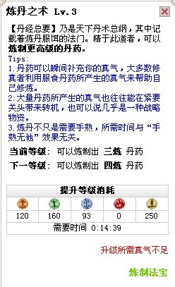在游艺《修真》中真气的修炼,可以通过丹药来进补。然而丹药乃是仙家之物,“药物易知,火候难传”,所以炼丹之术是要靠自己去炼制的。