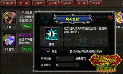新道具,新装备,让战斗随心所欲。新版本自然少不了新事物的出现,而道具和装备也是首推其冲。新道具——魔梭,让行军事半功倍。魔梭的的出现给英雄们的移动提供了极大的方便,利用魔梭可以瞬间将英雄传送至指定目的地,大大缩减了玩家的时间,要知道,时间就是金钱,在英雄世界争分夺秒更是决定着玩家未来的实力,如果不抓紧时间,你随时会被紧跟其后的人赶超!千里马需要伯乐,而伯乐也需要千里马,你是伯乐,而你的英雄便是千里马,赤手空拳的千里马毕竟跑不过坦克!所以,没有装备的千里马即使真有潜能也只能发挥一半,给他们好的装备,让他们全副武装,这样面对铜墙铁壁,他们同样能势如破竹。除了新道具之外,新装备也是本次新版的一大亮点,全新的饰品,高属性,高技能,让英雄攻无不克。如此诱惑的道具和装备,是不是让你担心会过于昂贵呢?放心吧,英雄世界坚持平等公正的原则,不需要你花费一分钱,就可以轻松获得道具装备!比你想象的还要便宜和容易。