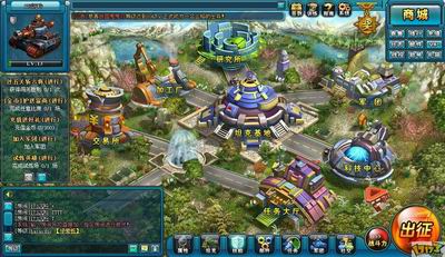 游戏界面左上方是坦克形象,左边是任务进度,左下方是聊天窗口,上方是公告和系统功能区,下方是游戏功能区,右下是基地和战场界面切换按钮。界面错落有致,玩家很容易就能找到想要的功能。但是在两个界面都没有什么动态效果,如果在基地添加几个行走的工程人员,在前线放上几只翱翔的海鸥,画面能更显活泼。