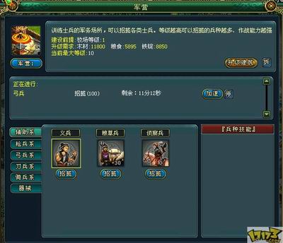 资源详情:显示单下的资源存量以及总数等等消息,还可以对军饷的配对比例进行调配,是金钱多点还是粮食多点,这个很符合古代的军饷制度。玩家可以根据自己城市的资源多寡,来合理分配多余资源哦。 调配军队:这地方就是让玩家对其军队分配进行调动和调节的地方。 在左下是战役,这个是在玩家等级到达激活剧情时才能被开启的任务。 在下去是区域,这里是练习用兵的地方,打击土匪和强盗,可以提高人民的安定和民心,玩家一定要记住要经常打击土匪要不玩家的城镇是会被影响的。 游戏界面的下面是一些常用的系统: 军情:军队的动态吗,驻扎地方都在此显示。