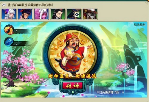 玩家可以通过高级寻仙中的请仙来获得天才地宝。每位玩家每天拥有10次免费请神的机会,当免费请神次数用完后,玩家可以花费元宝/绑元宝再次请仙。请仙所得天才地宝均为绑定。