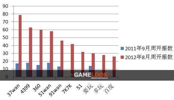根据2012年8月开服数来排名,目前国内前五强的独立网页游戏平台(以独立域名网站来统计)分别为37wan、4399、360、51wan、91wan,而其同比增幅更是惊人普遍超过了200%,在网页游戏已经收入规模化的情况下,领先平台如此大幅的增长实属不易,值得褒奖。