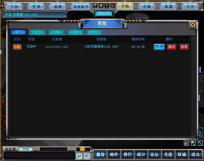 在空军的保驾护航下,陆军的任务主要是进行掠夺,杀光、烧光、抢光是陆军干的活了,陆军规模的大小同样决定与自己陆军基地及其他综合实力,同样由英雄带兵出发,英雄的等级决定了带兵的规模及作战能力。通过军情按钮可随时查看陆军进军的详细时间。请一定注意空军要先到封锁领空,陆军才能进入进行战斗,两军到达目的地时间请合理控制好,否则后果不堪严重,具体情况请玩家自己体验。