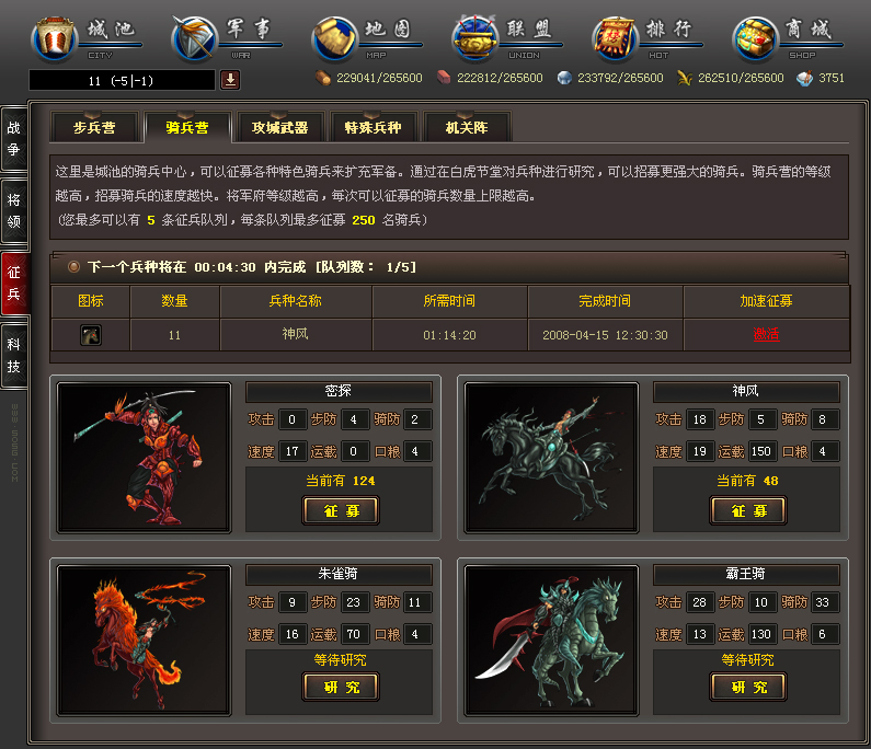,其征兵时间越短,可以在科技界面中对士兵的防御、攻击进行升级。